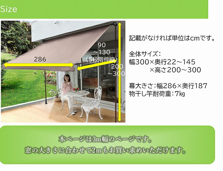 商品スペック サイズ 約幅303×奥行22〜145×高さ200〜300cm 素材 支柱・アーム:スチール天幕:ポリエステル(UVカット加工) 物干し竿:ステンレス・スチール 機能 物干し竿耐荷重:7kg 備考 2階以上への設置はご遠慮ください前幕付きの3mはこちらから! 前幕なしの2mはこちらから! 前幕なしの3mはこちらから! 前幕付きの2mはこちらから! 前幕付きの3mはこちらから! その他、日よけ、サンシェードはこちらから!!